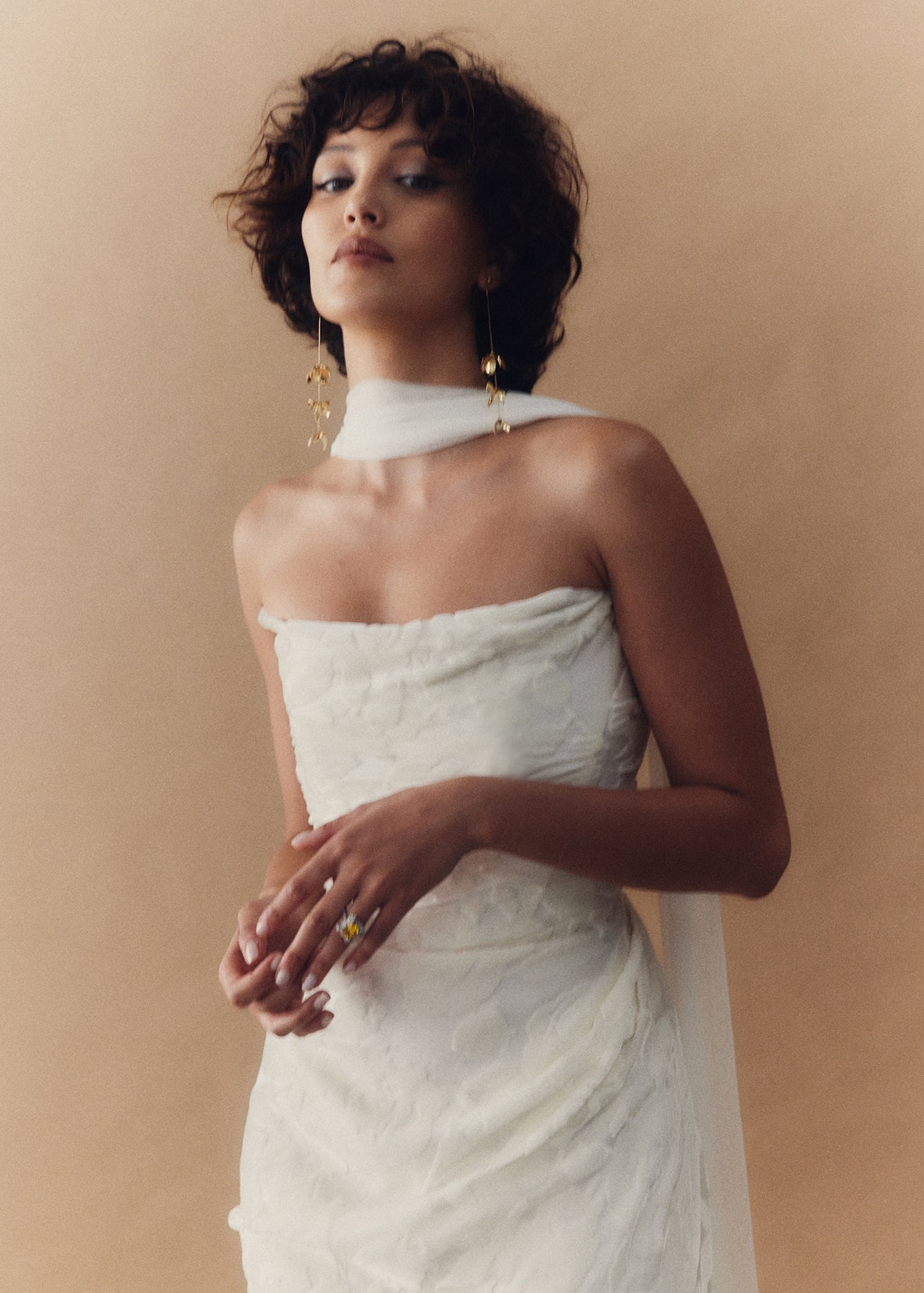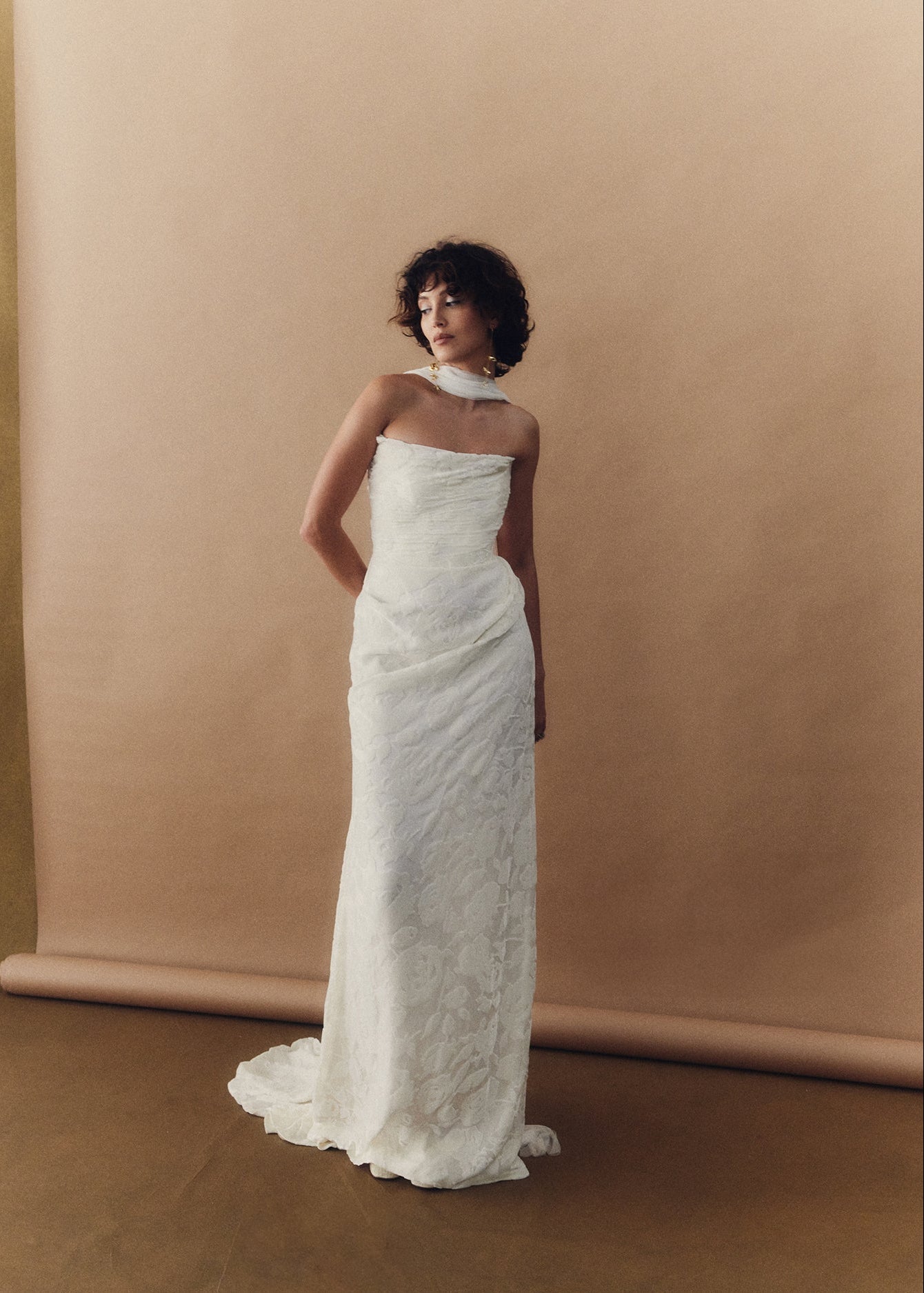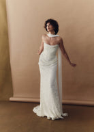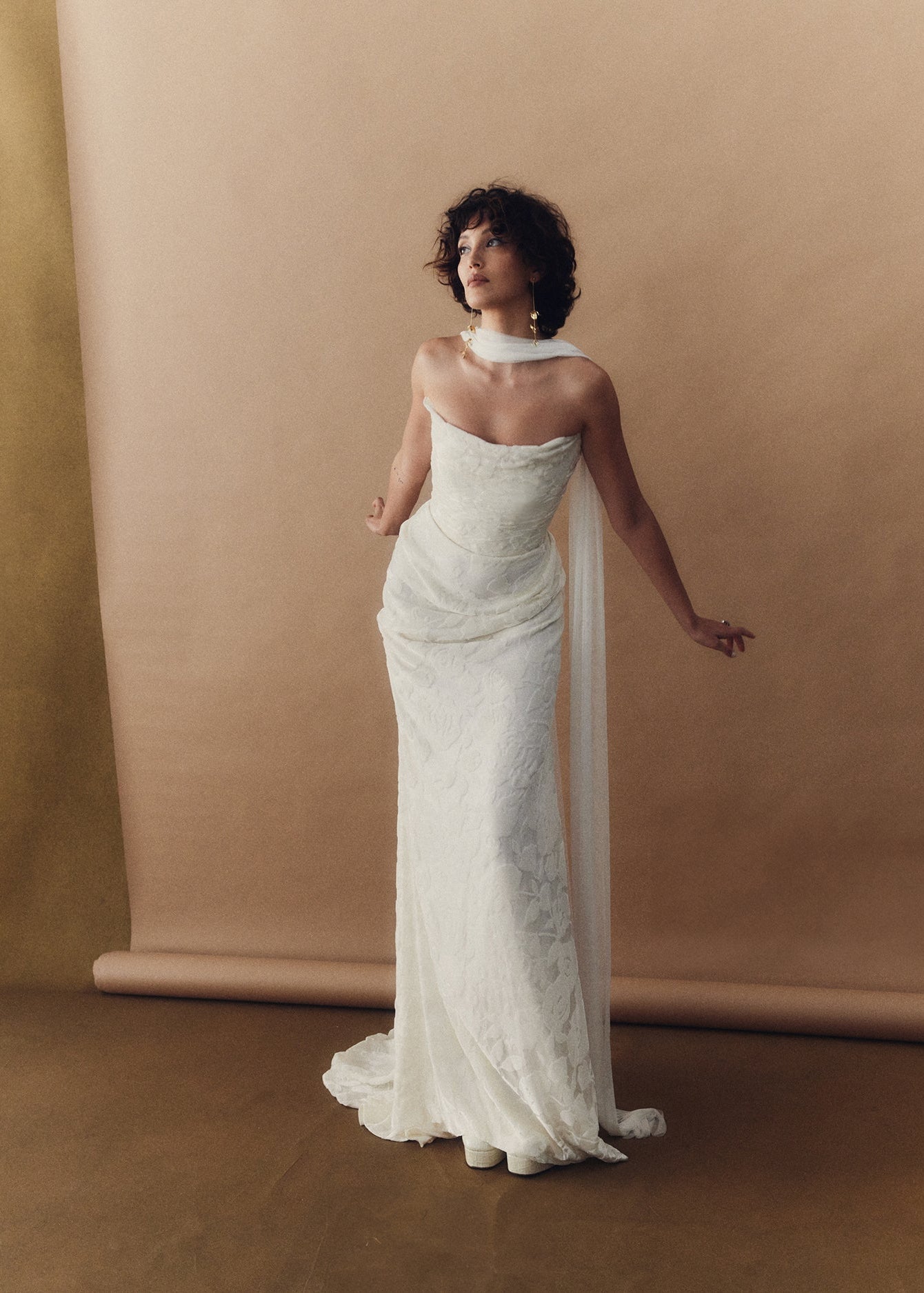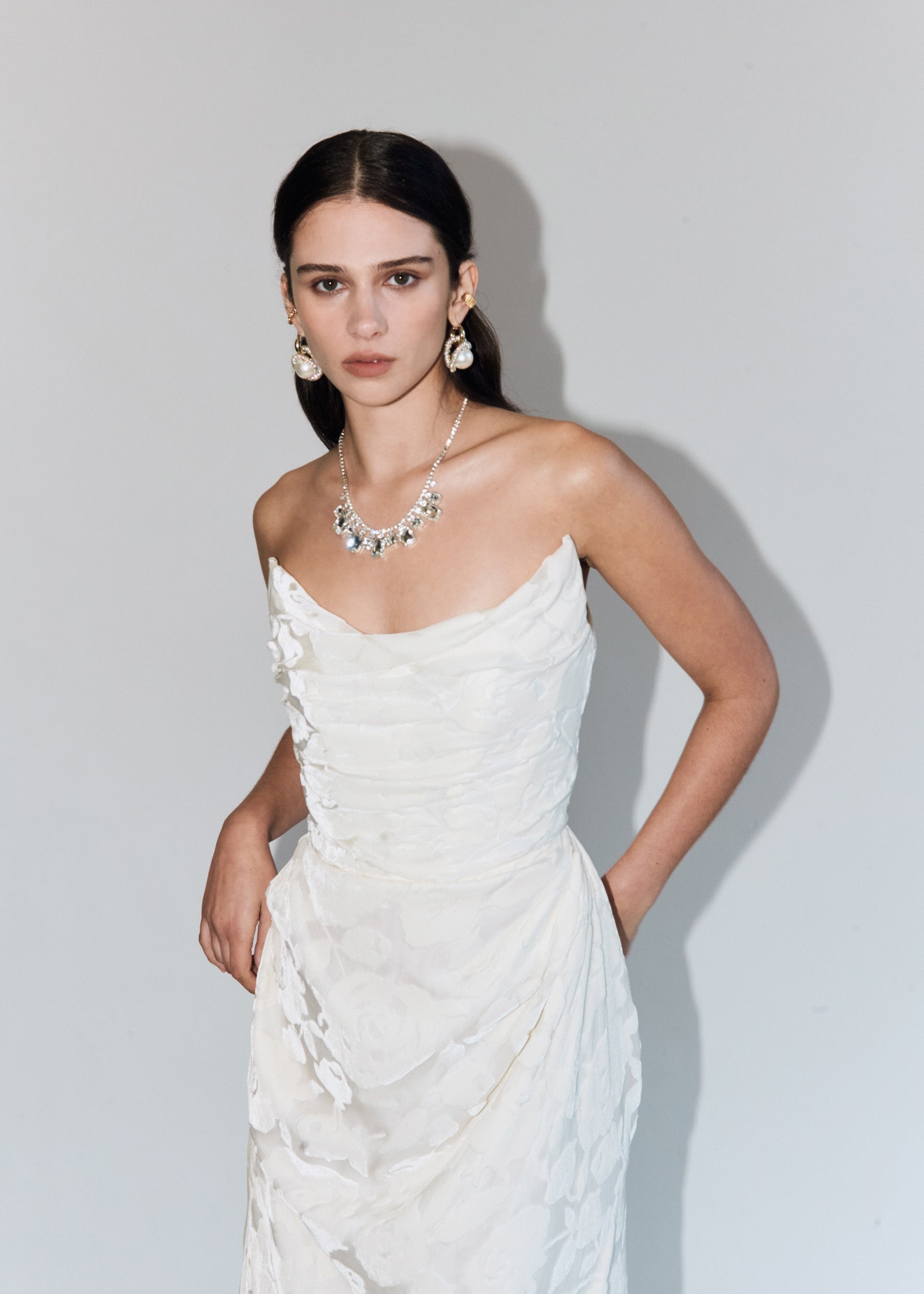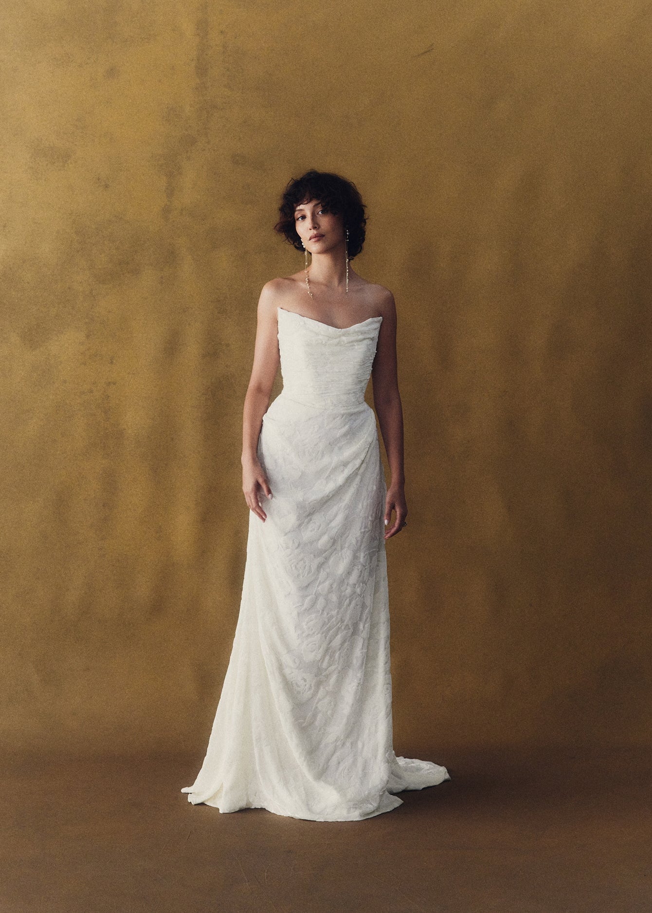 Camille is wrapped in a delicate draping of buttery burnout velvet that artfully sculpts the feminine form. She embodies elegant refinement, poetic romance and understated luxury with every step.