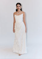 Her neckline is gently scooped while the bodice is carefully corseted to accentuate the waist and provide support. The sensual skirt features a high side split and fluid draping that is gracefully gathered on one side, hugging the hips to carve out a silhouette that embodies alluring femininity.