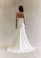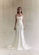 In a modern twist for the cool bride, the bodice draping carries down into a universally flattering V finish over the waist. Cut on the bias to hug all the right places, the Jolie skirt is a statement of subliminal simplicity with godets that create a striking flare.
