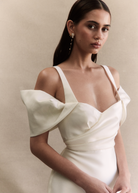 With sculptural off the shoulder sleeves and a delicate sweetheart neckline to contour the decolletage with undeniable perfection, Kimia also features a barely there back that fastens with a classic set of covered buttons. With a built in bustier corset and underwire cups, she is artfully draped to wrap the figure in an incandescent twill fabrication, and lined with a soft stretch silk.