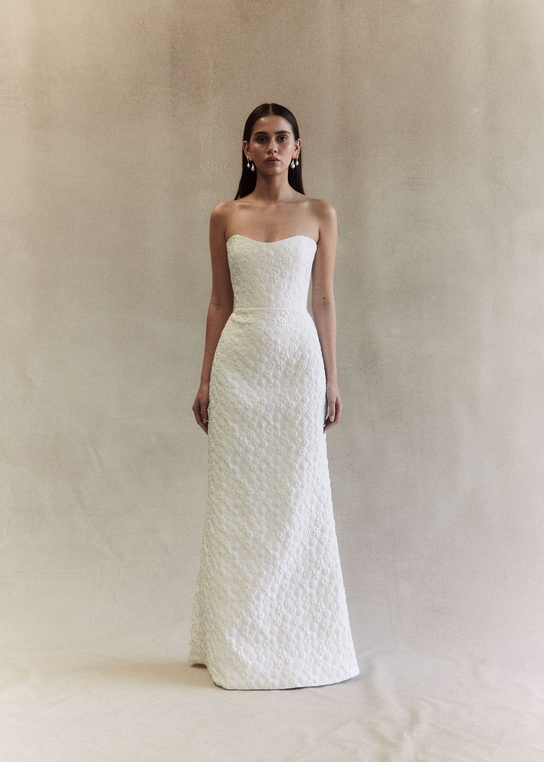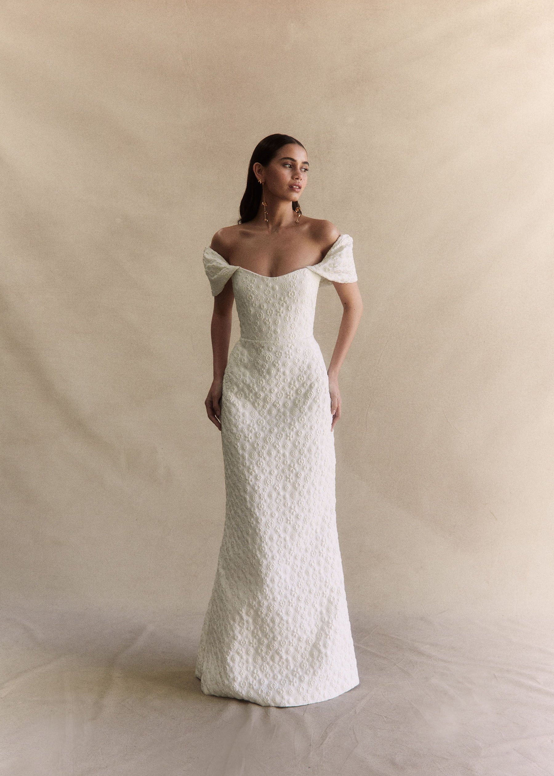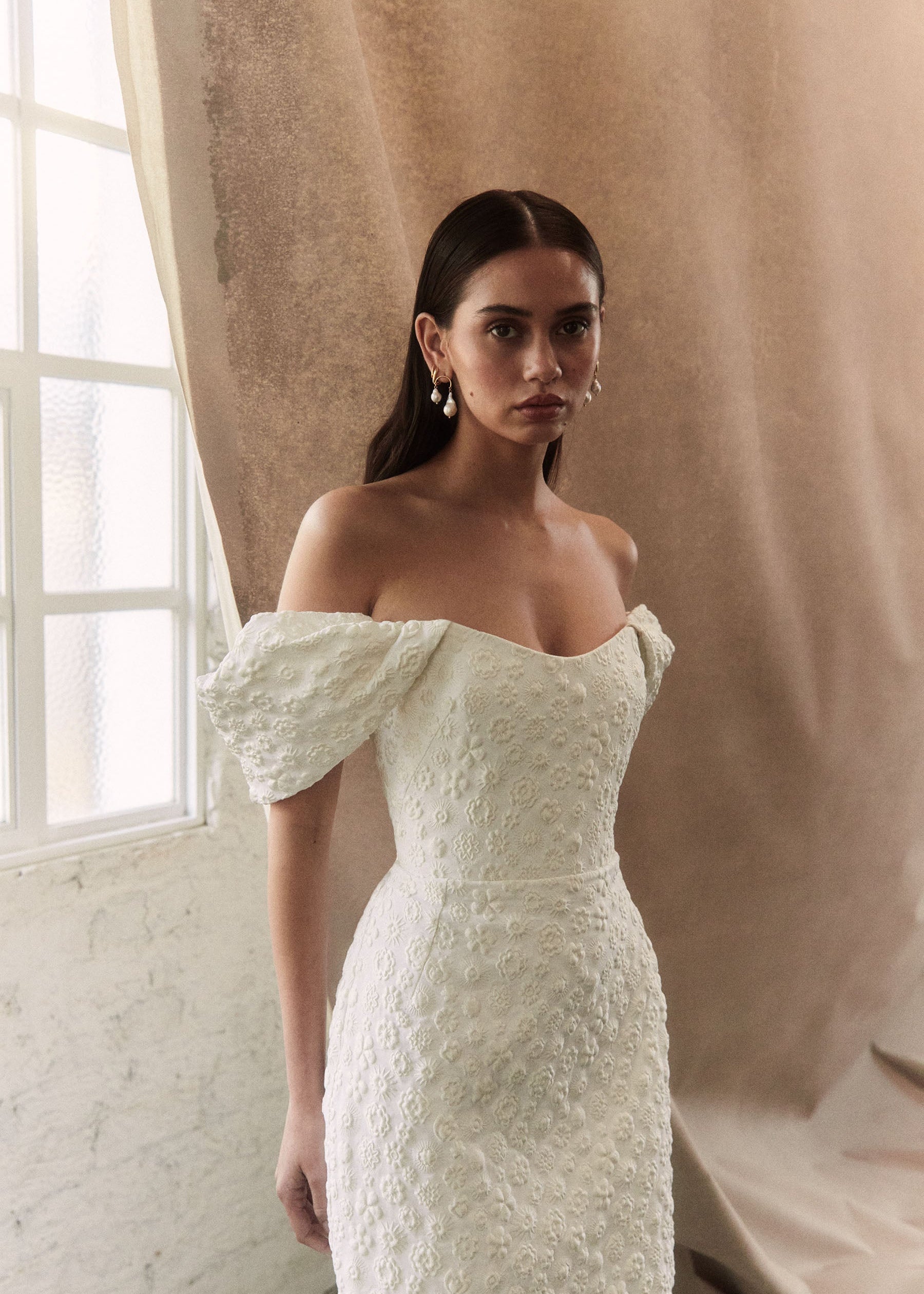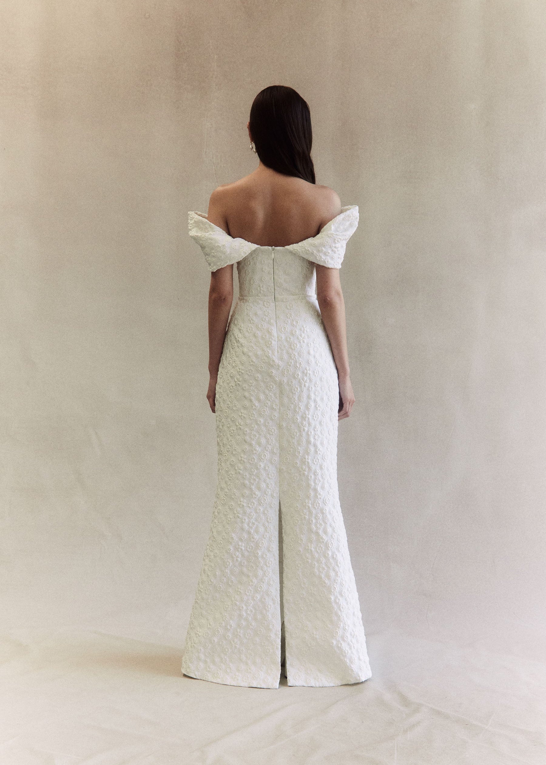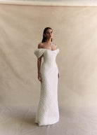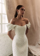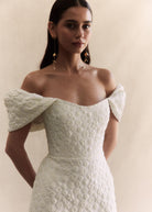 Crafted from an embossed floral Italian Jacquard, she features voluminous detachable sleeves, a delicately scooped neckline and a structured bodice, with full boning. Viola’s sleek skirt is designed to gently sculpt the figure with effortless perfection, and is finished with an elegant back split. The chic and feminine silhouette is reminiscent of much loved styles Emilia and Anouk, combining a minimalist and contemporary design with textural bliss.