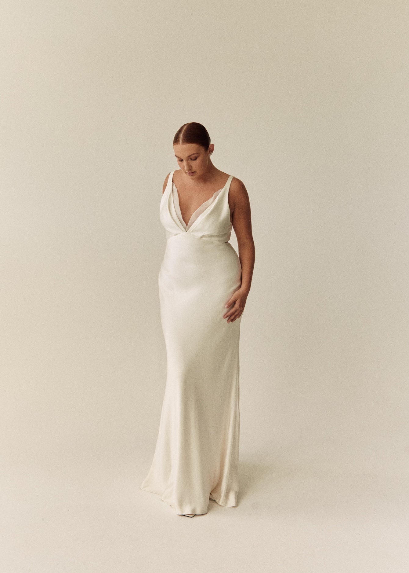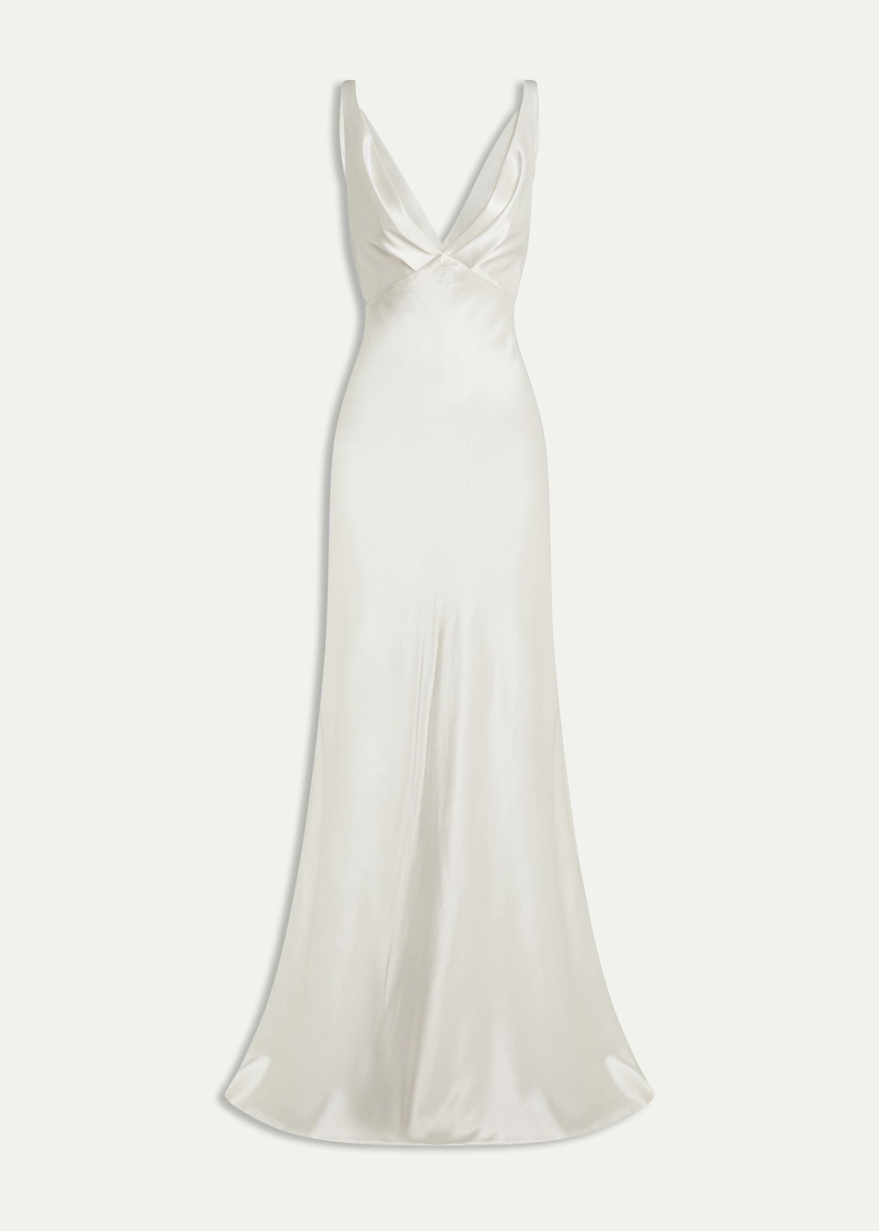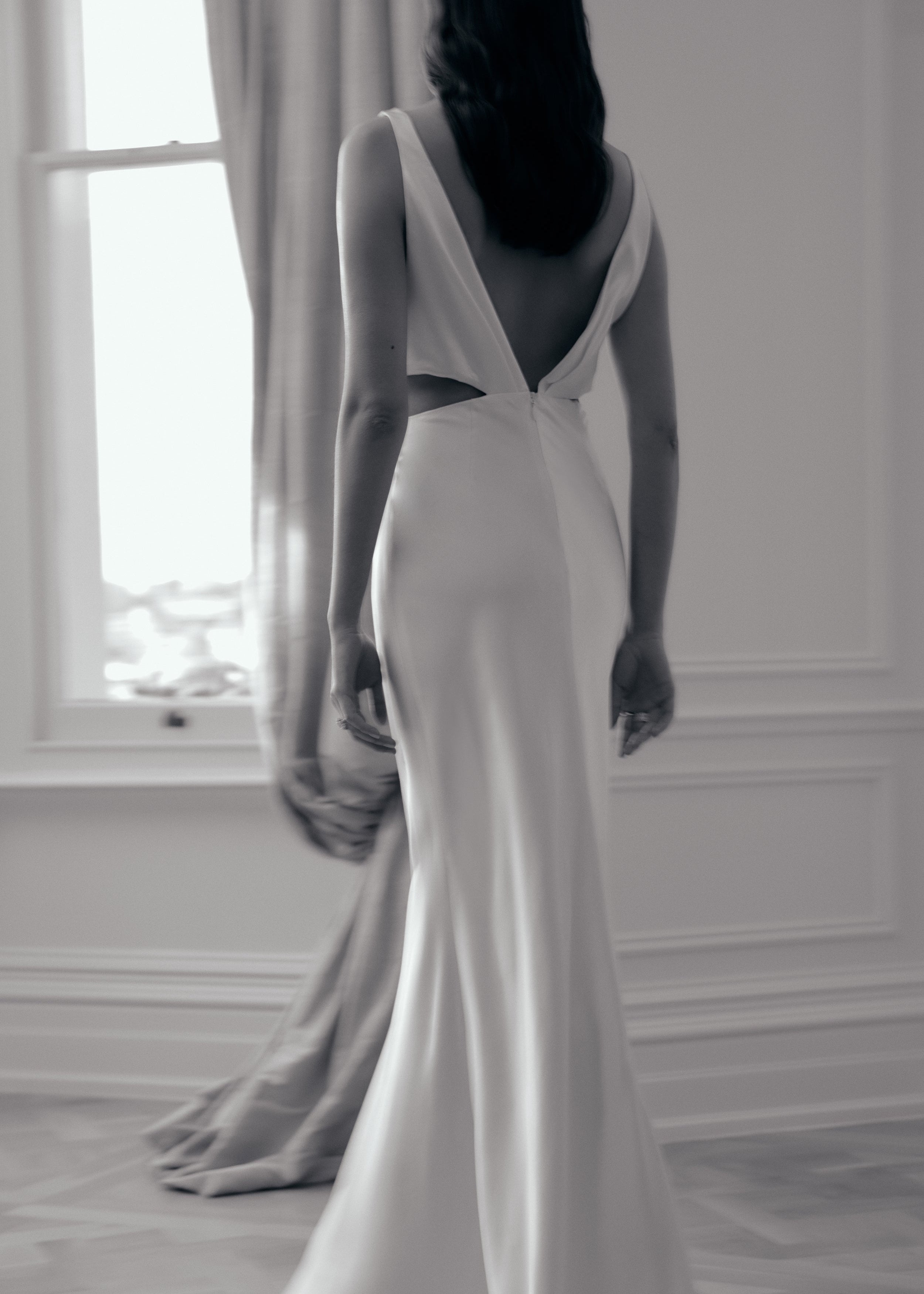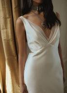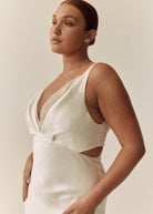 The Rebecca Dress is an elegant bias cut style, featuring barely there waist cutouts and romantic pleat detailing on the neckline that continues down the sensual low V back.