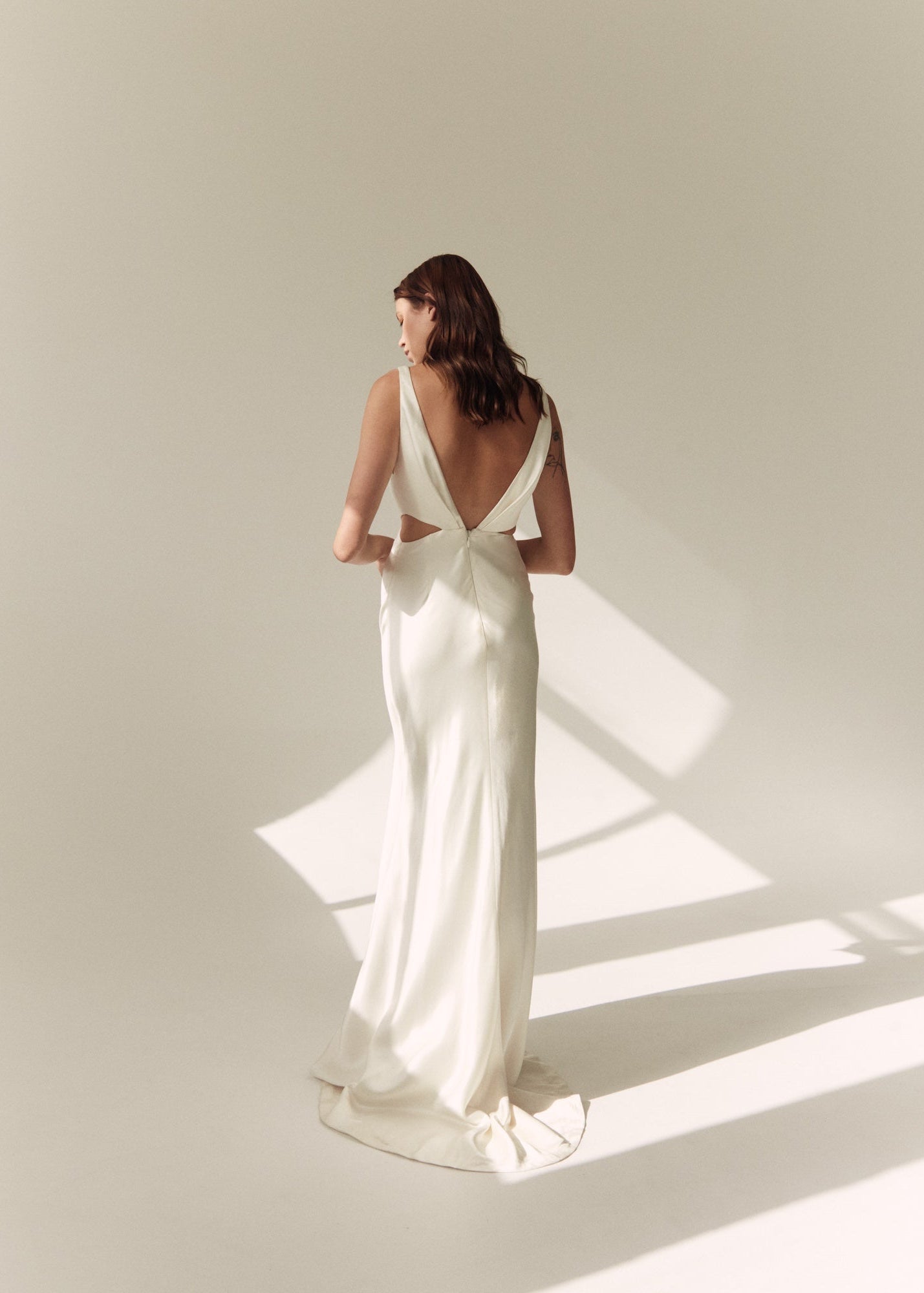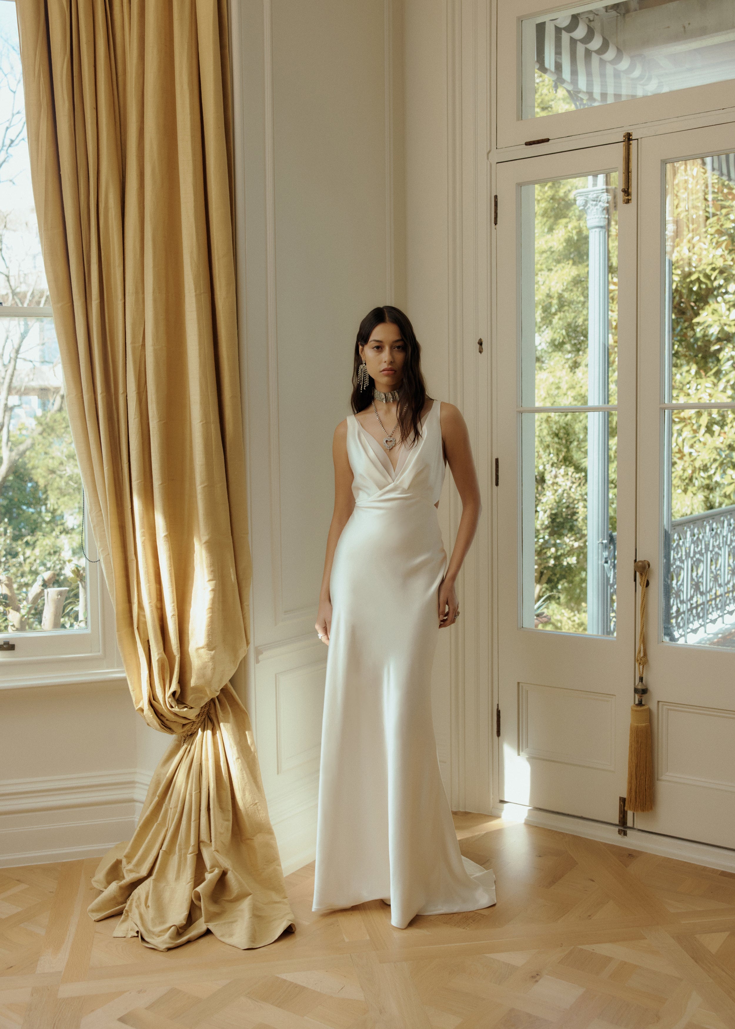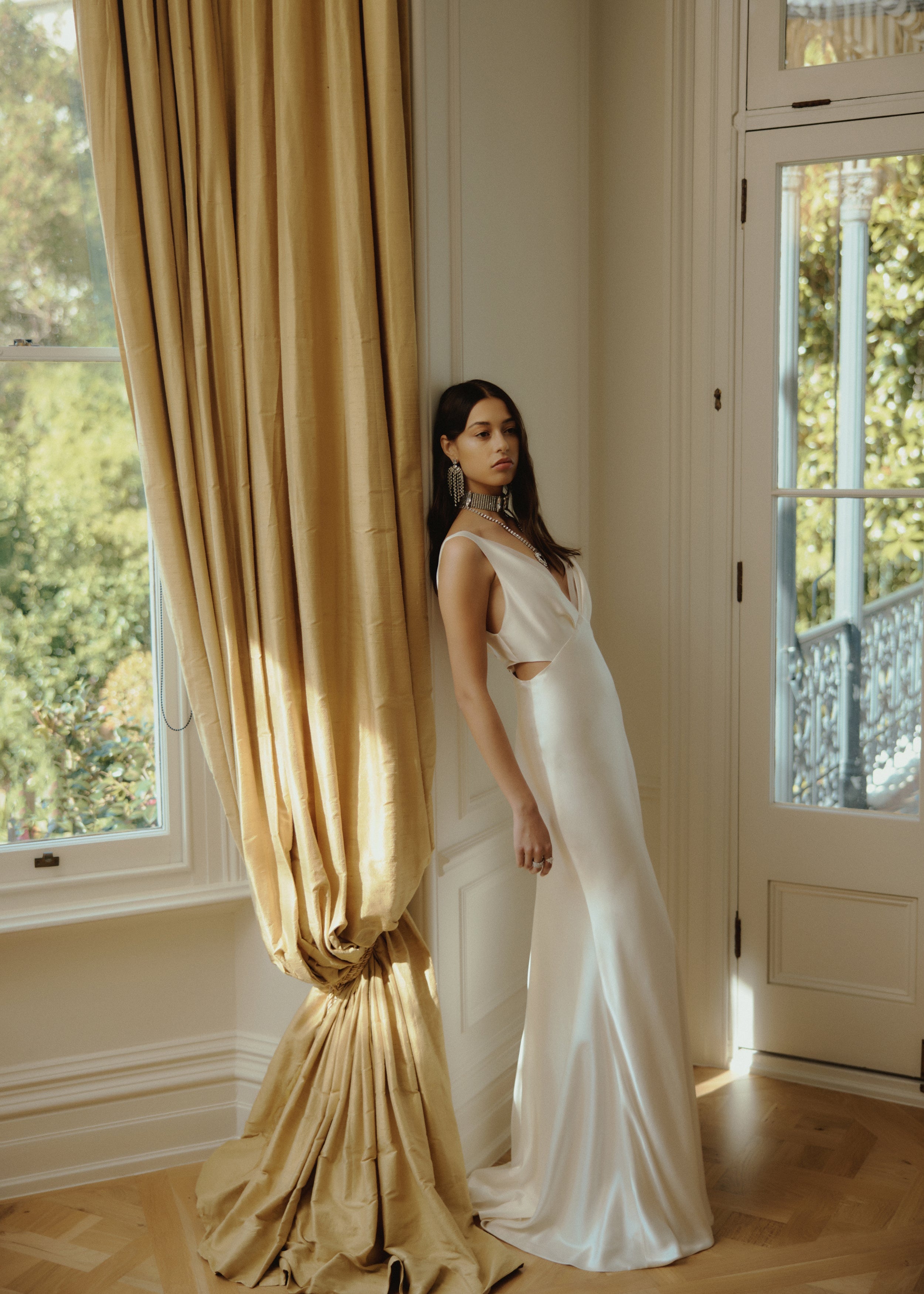 The Rebecca Dress is an elegant bias cut style, featuring barely there waist cutouts and romantic pleat detailing on the neckline that continues down the sensual low V back.