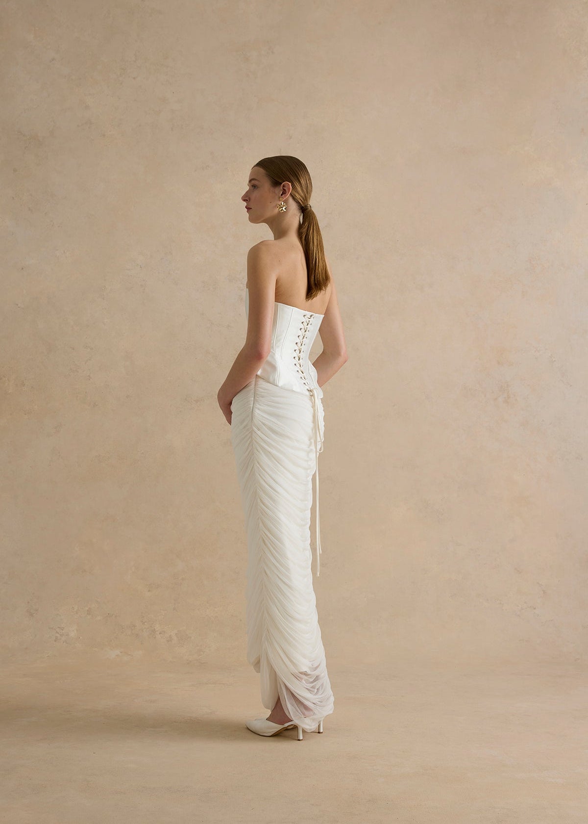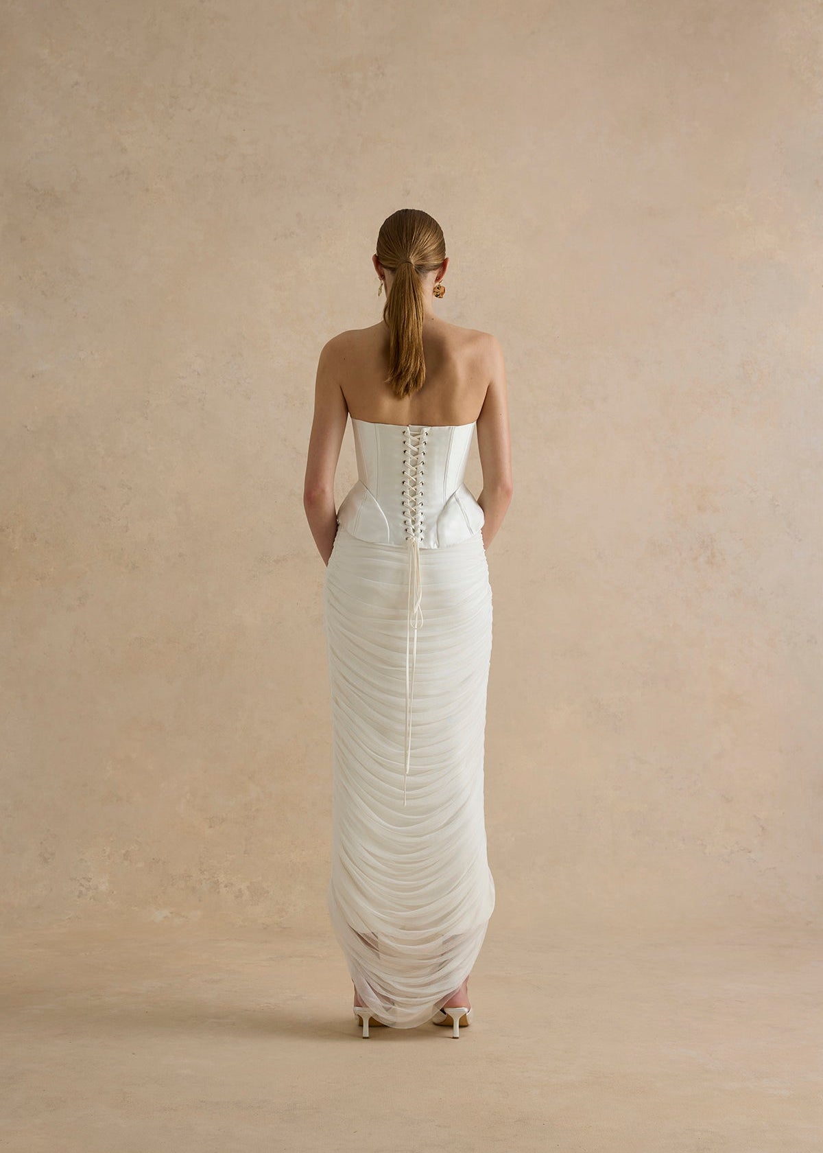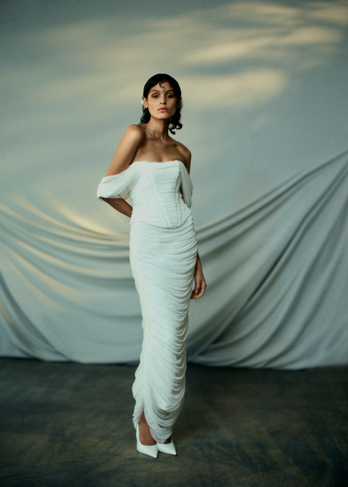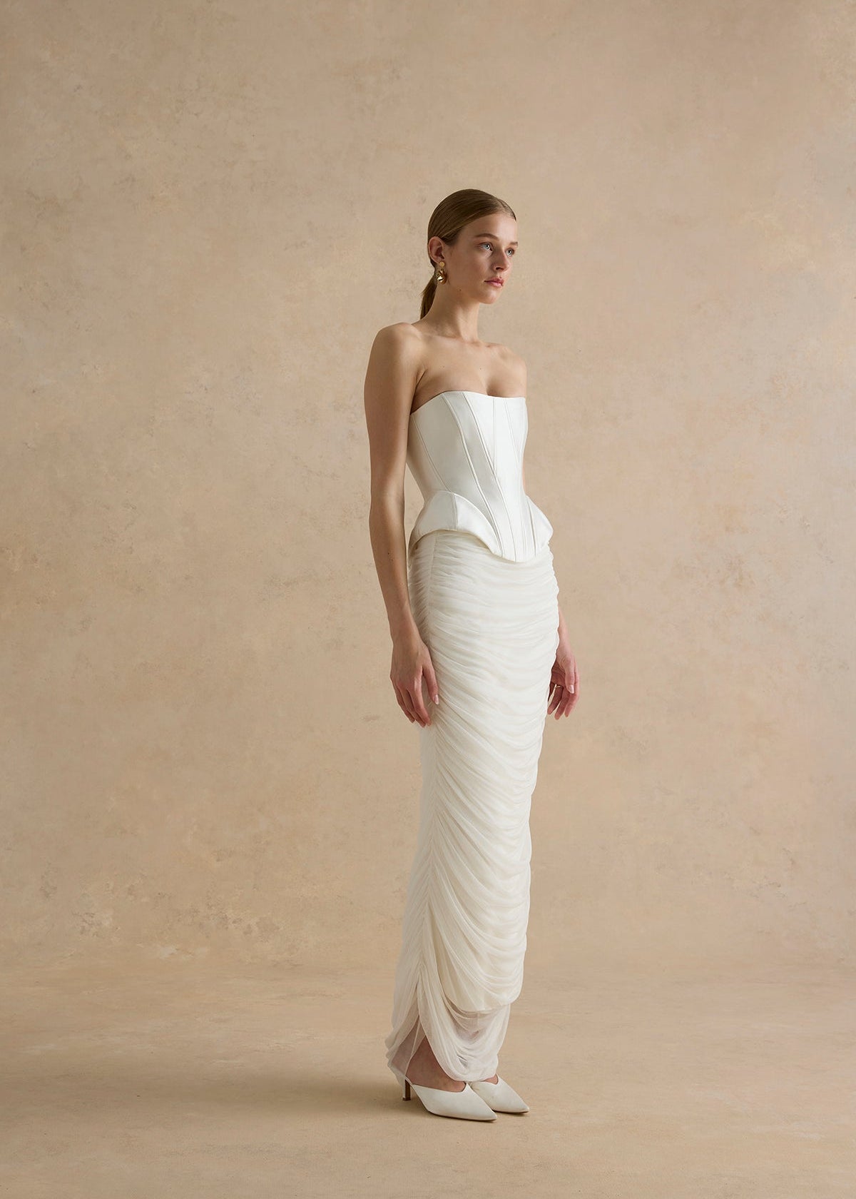 A column skirt made from the softest silk tulle, gathered up the side seams, to create the artful drape, cascading down the front and back of the skirt.