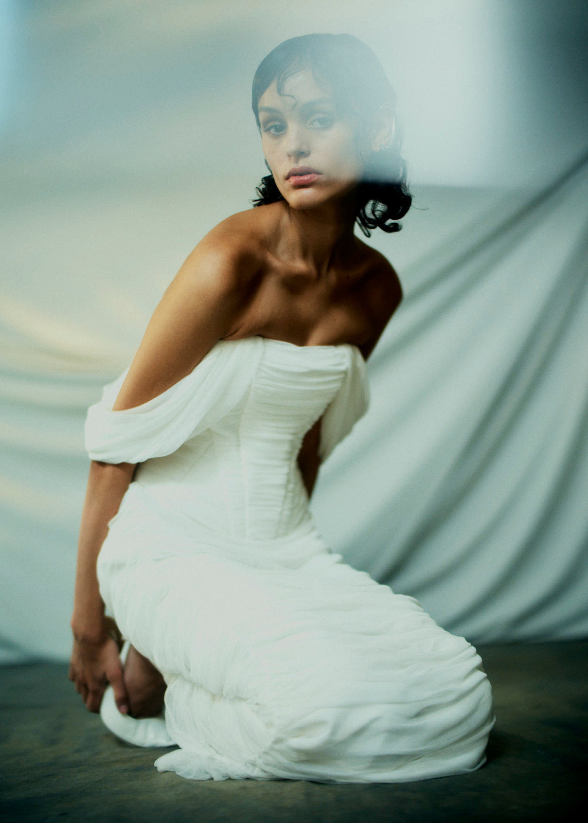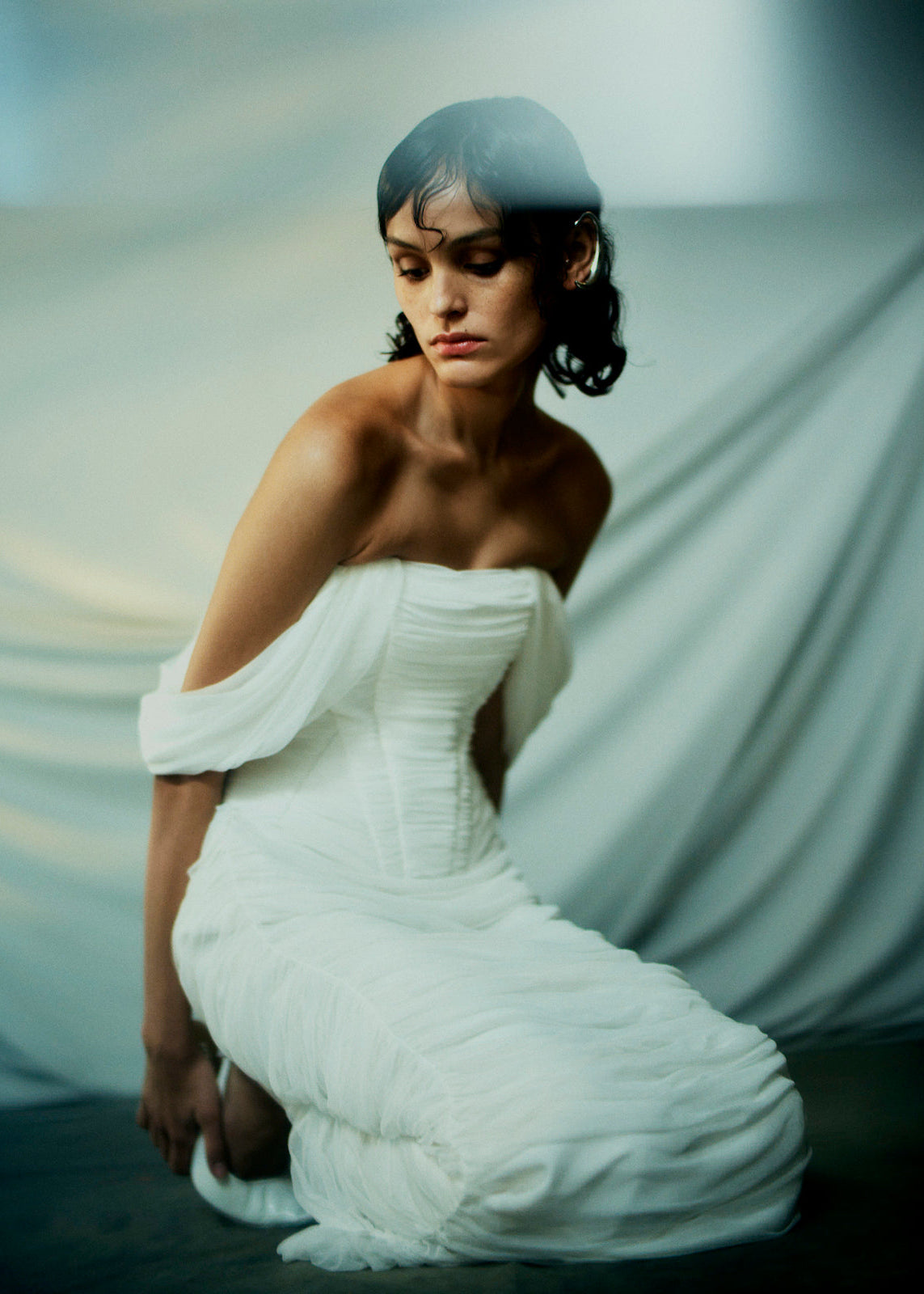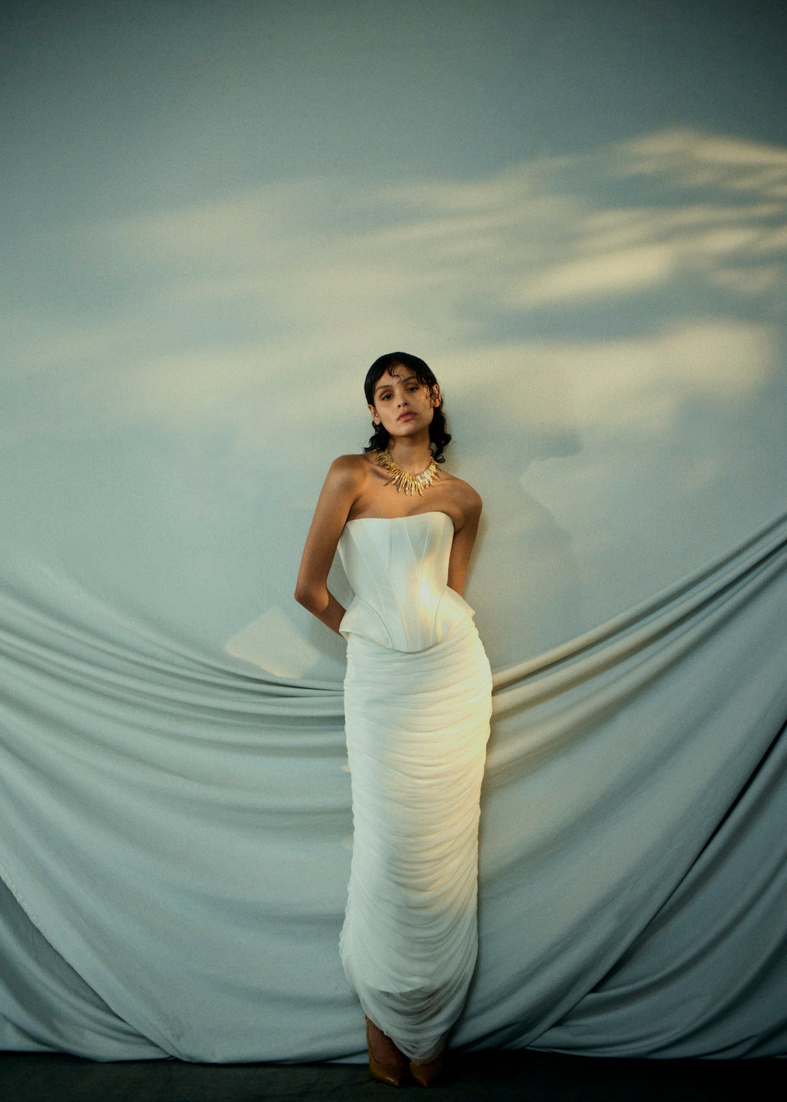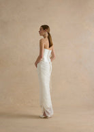 A column skirt made from the softest silk tulle, gathered up the side seams, to create the artful drape, cascading down the front and back of the skirt.