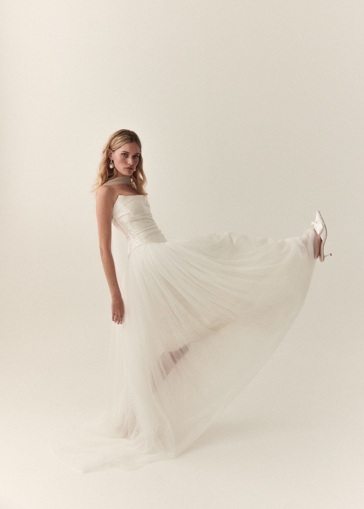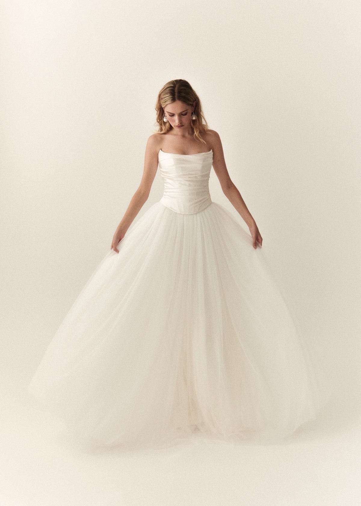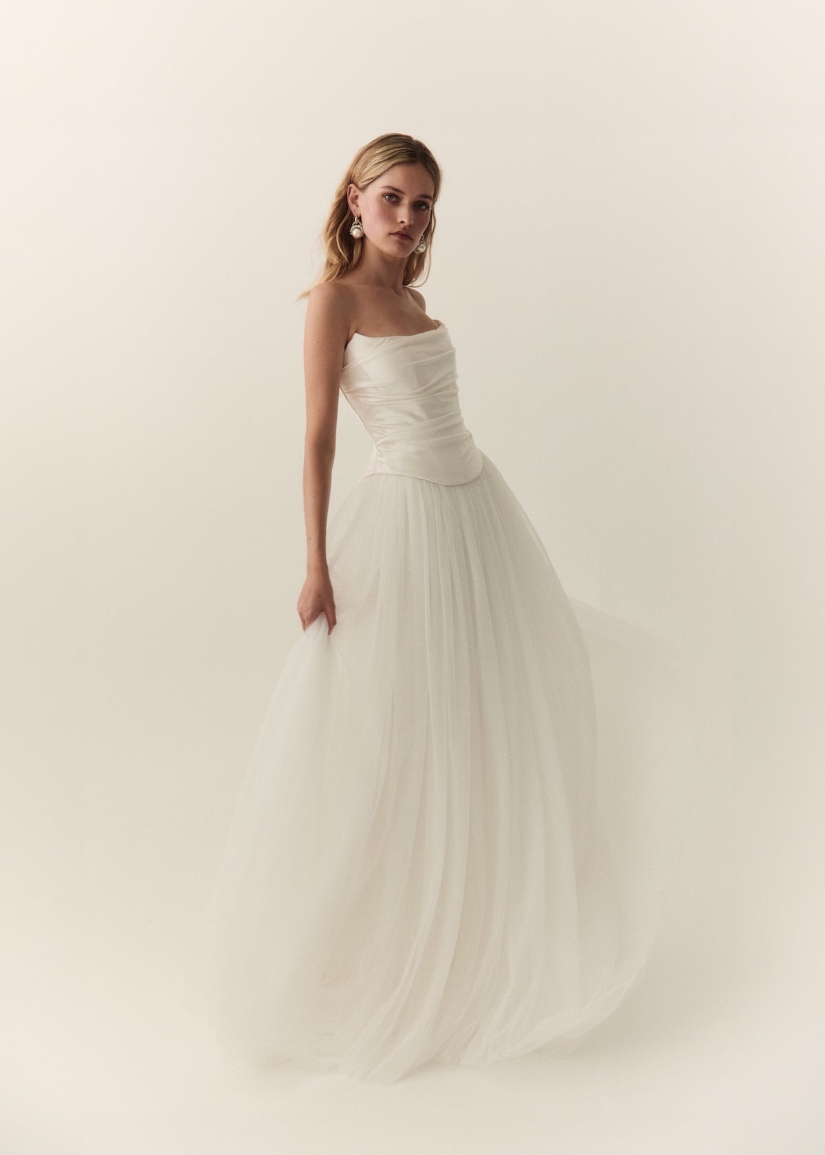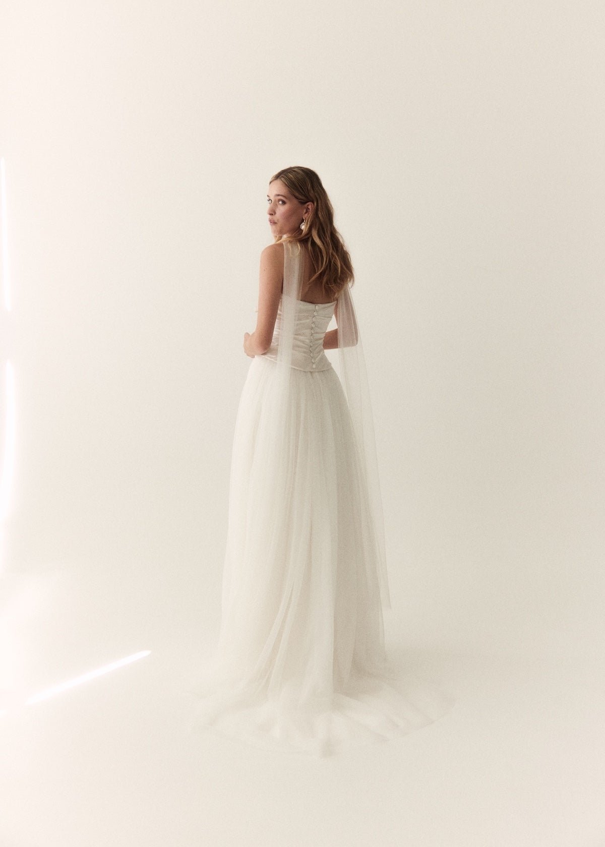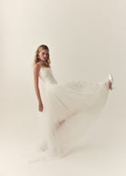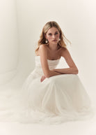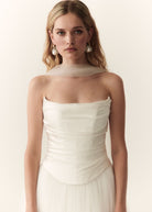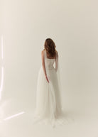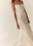 Mabel's beautiful panelling is draped in a fluid silk satin with a soft scooped neckline and flattering dip in the front waist. Finished with hand made loops and covered silk buttons, Mabel is the perfect modern, yet timeless bridal separate.