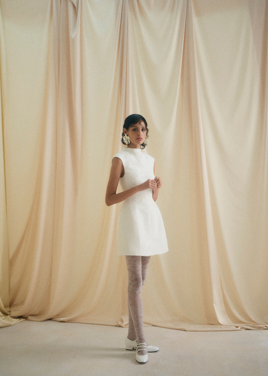 Defined by its sharp, architectural lines, anchored by a high neckline that brings a distinctly modern sensibility to the silhouette. This contemporary edge is softened by the delicate lace construction, which adds texture and a sense of quiet romance. The interplay of structure and softness creates a balanced tension - feminine yet bold. A discreet layer of shape well under the skirt subtly sculpts the shape, giving the piece a controlled, slightly exaggerated volume.